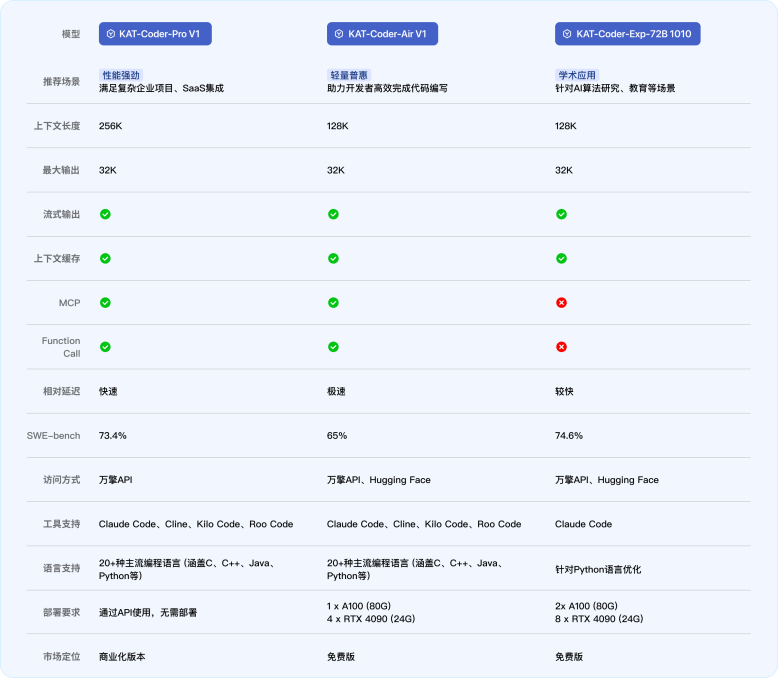 KAT-Coder 系列模型旨在以卓越的性能与极具竞争力的成本,三款不同定位的模型将满足各领域开发者的需求:
