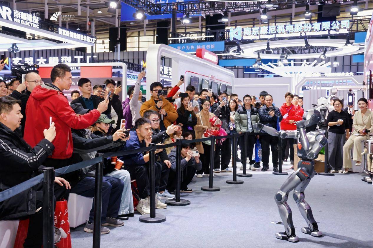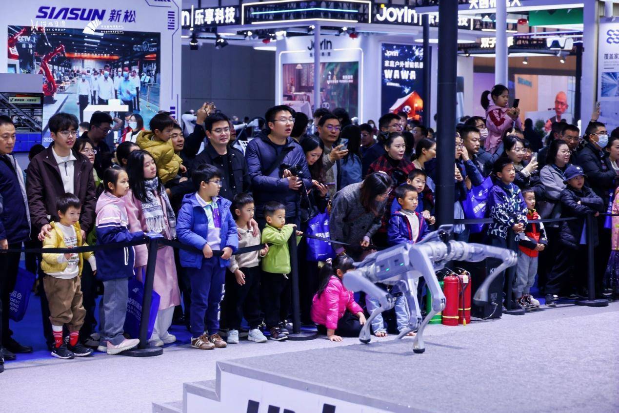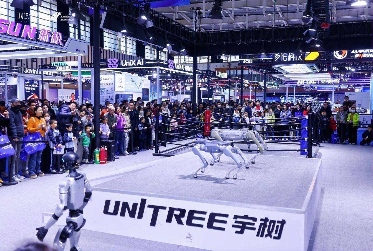 宇树科技展台前一个小型拳击台上,两个小巧灵活的机器人正激烈对战,它们出拳迅速、闪避敏捷,引得周围观众阵阵喝彩。这是本届博览会人头攒动、热闹非凡的鲜活写照。