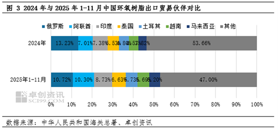 就出口贸易伙伴来说,2025年中国环氧树脂主要出口至俄罗斯、中东以及东南亚等地区,但出口流向趋于分散。其中出口至阿联酋环氧树脂量增加较明显,占比由7.01%升至10.30%,出口至俄罗斯环氧树脂量缩减较明显,占比由13.23%降至10.72%,其他销往印度、泰国、土耳其、越南、马来西亚等也出现不同程度增加,占比分别增加1.35、1.10、0.93、1.12、1.38个百分点。