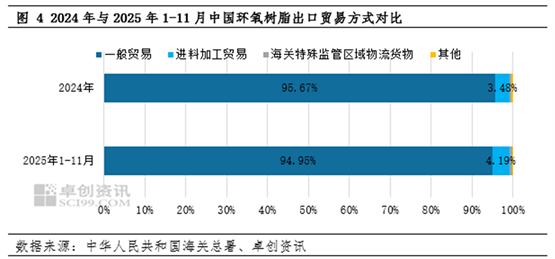 从出口贸易方式来看,2025年还是以一般贸易为主,1-11月占比达94.95%。目前出口贸易方式有一般贸易、进料加工贸易、海关特殊监管区域物流货物、保税监管场所进出境货物等方式,其中一般贸易占据主导地位,进料加工贸易次之,两者合计占比99.14%。