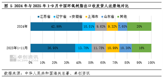 从出口收发货人注册地来看,江苏省占比虽有下降,但仍居于首位,其他省份占比有所增加。目前江苏省、辽宁省、安徽省、上海市、山东省是环氧树脂主要出口收发货人注册地,与环氧树脂工厂聚集地相对应,对比2024年,江苏省占比下降6.04百分点,其余四地分别增加3.27、2.15、1.67、2.65个百分点。