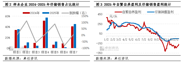 通过对样本企业2024-2025年仔猪外销占比数据可以看出,多数企业2025年仔猪外销占比有所增加,尤其是样本企业2,2025年仔猪外销占比增加114.29%。2025年养殖端仔猪外销占比多数增加,核心原因有三:一是猪价持续低迷导致育肥端亏损扩大,外销仔猪可提前锁定收益,规避后期商品猪出栏价格下跌风险;二是,相较于自繁自养,仔猪销售的盈利空间更为可观,这一差异成为推动仔猪外销的关键动力。据卓创资讯(301299)统计数据显示,截至12月23日,2025年自繁自养育肥盈利为83.16元/头,而仔猪销售盈利达128.23元/头,后者较前者增幅达54.20%,有更高的盈利回报;三是企业缓解现金流压力的现实需求,部分企业面临资金周转压力,扩大仔猪销售成为快速回笼资金的重要途径。