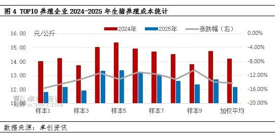 据卓创资讯统计,2025年TOP10养殖企业养殖成本下滑幅度均超10%,并且2025年TOP10养殖企业平均成本为12.16元/公斤,同比下滑14.18%,幅度显著。2025年养殖成本下滑,核心源于饲料端优化和生产效率提升。其中,饲料成本下行是首要推手。受全球供应宽松及中美贸易关系缓和影响,玉米、豆粕等核心原料价格同比明显走低,直接降低基础成本。另外,生产效率提升大幅压缩平均成本。头部企业通过基因改良筛选高繁殖率种猪,行业平均PSY明显提升,降低仔猪单位成本。此外,头部企业规模化扩产带来的固定成本分摊效应,以及全产业链布局对冲波动的协同作用,也进一步巩固了成本优势,推动行业整体成本中枢下移。