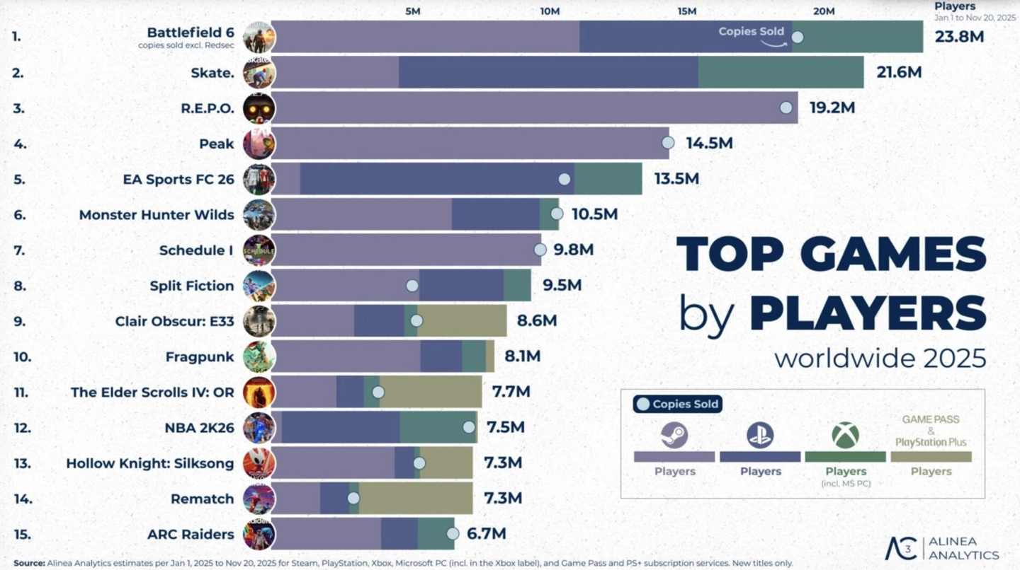 从玩家规模来看,2025年玩家数量最多的游戏为《战地风云6》(统计未包含免费大逃杀模式《禁区冲突(REDSEC)》)。在Xbox Series、PS5与PC等全平台合计,《战地风云6》的购买玩家数达到2380万人。紧随其后的是免费的滑板题材游戏《Skate.》,以及两款人气派对类作品《R.E.P.O.》和《Peak》,玩家规模分别为1920万人和1450万人。