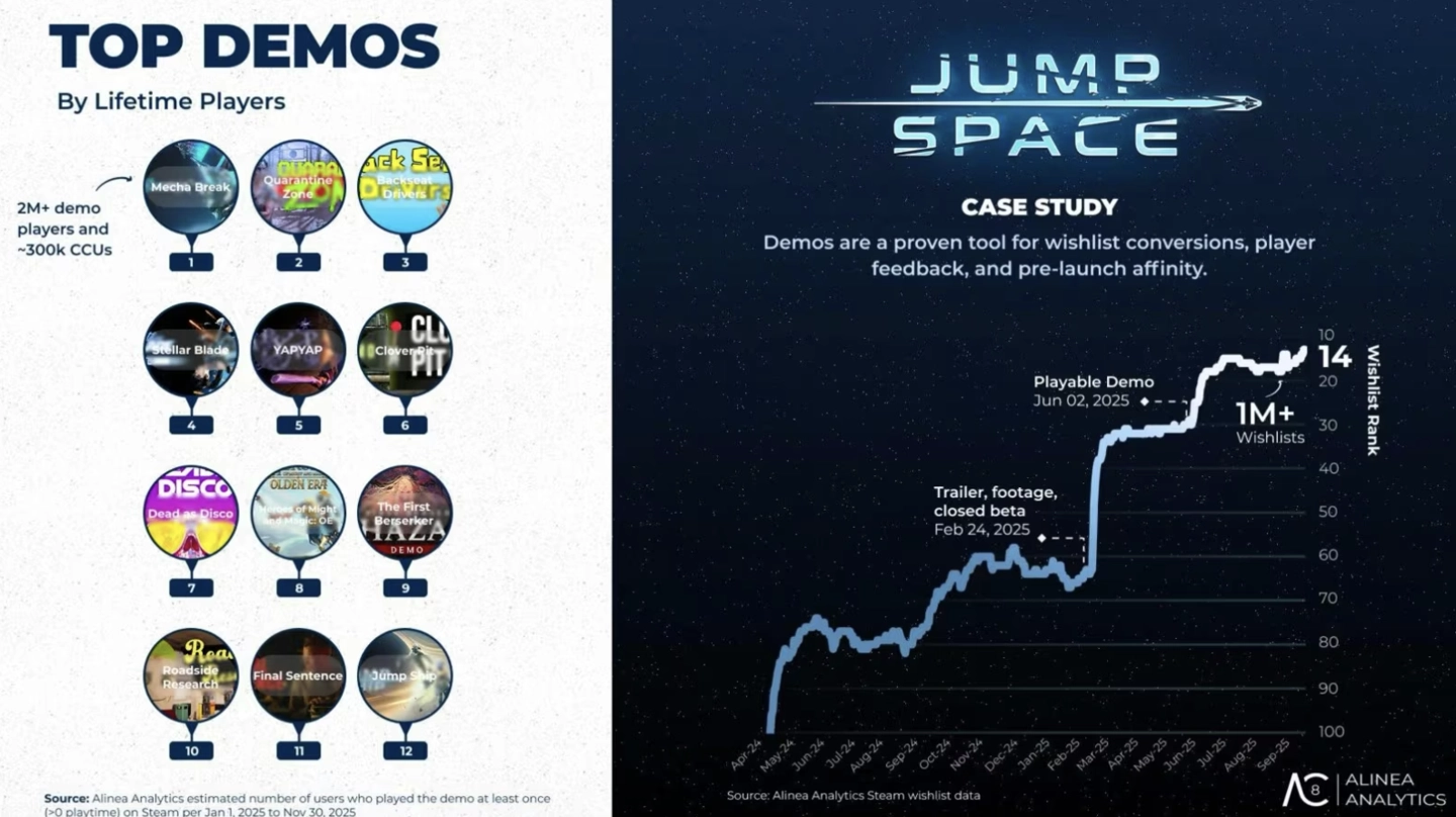 试玩数据方面,《解限机Mecha Break》成为2025年最受欢迎的Demo作品(统计可能不包含公开测试),试玩玩家超过200万人,同时在线峰值人数突破30万。