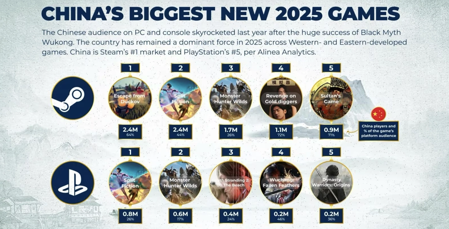 Alinea Analytics指出,中国已经成为Steam的最大市场,同时也是PlayStation的第五大市场。在Steam平台上,中国玩家占比最高的热门游戏依次为《逃离鸭科夫》(64%)、《双影奇境》(44%)和《怪物猎人:荒野》(26%);在PlayStation平台,中国玩家占比最高的作品则是《双影奇境》(26%)、《死亡搁浅2》(24%)和《怪物猎人:荒野》(17%)。