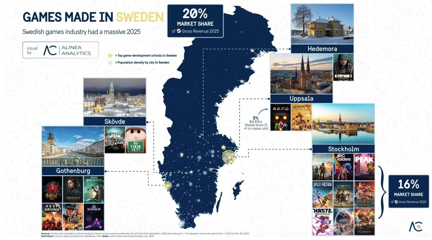 同时,数据显示,在Steam平台上,瑞典开发者推出的游戏作品约占Steam年度总收入的20%,使瑞典成为2025年Steam平台全球营收最高的国家。