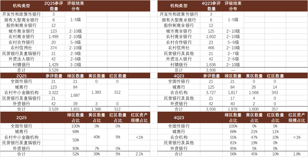 央行对银行业金融机构评级结果显示,高风险机构数量趋于减少、资产规模基本稳定。央行对3,529家银行金融机构评级,其中8-D级“红区”银行312家,数量占比8.8%(较4Q23末的9.1%微降),资产规模9.4万亿元,占比2.1%(较4Q23末的1.8%微升)。分机构类型看,全国性银行、外资法人银行中无高风险银行,而城商行、农村金融机构、民营银行及直销银行中有9%为高风险银行。分区域看,北京、天津、上海、重庆、浙江、江苏、江西、福建、西藏9个省区市辖内无“红区”银行。