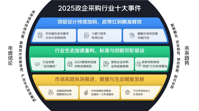 2025年,中国政企采购行业迈入数字化转型与高质量发展的关键攻坚期。政策体系持续完善、数智技术深度渗透、产业生态加速重构,成为本年度行业发展的核心特征。从顶层设计的密集出台到行业标准的迭代完善,从创新理念的落地实践到市场主体的协同发力,本文通过梳理2025年政企采购行业十大核心事件,全景呈现行业发展全貌。
