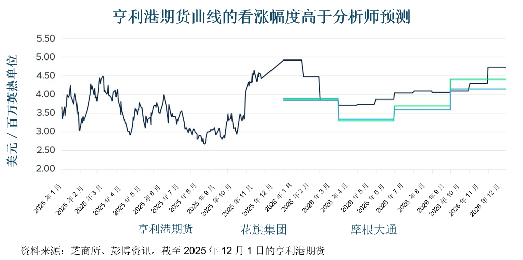 天然气交易员将密切关注已进入启动阶段的美国液化天然气项目进展,以及预计于2026年至2027年投产的相关项目。液化天然气的产能扩张意味着美国原料气需求将大幅增加,而原料气需求的预期增长发生延迟可能对亨利港期货价格形成压力。截至2025年12月,亨利港期货价格已上升至每百万英热单位4.70美元以上。
