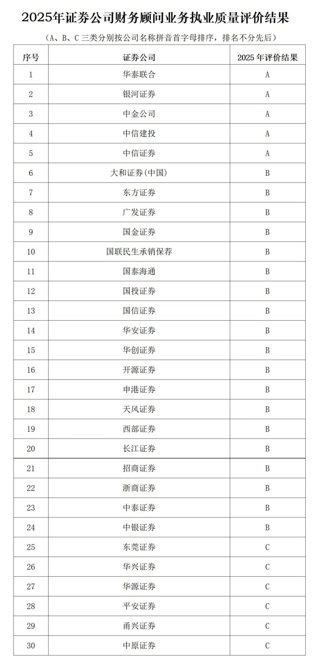 【大河财立方消息】12月30日,中国证券业协会公布2025年证券公司财务顾问业务执业质量评价结果。
