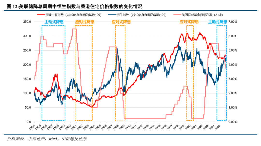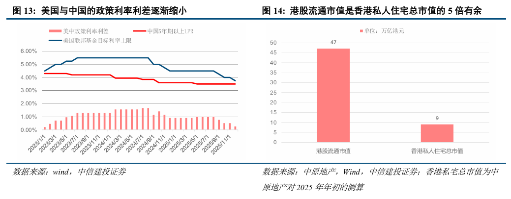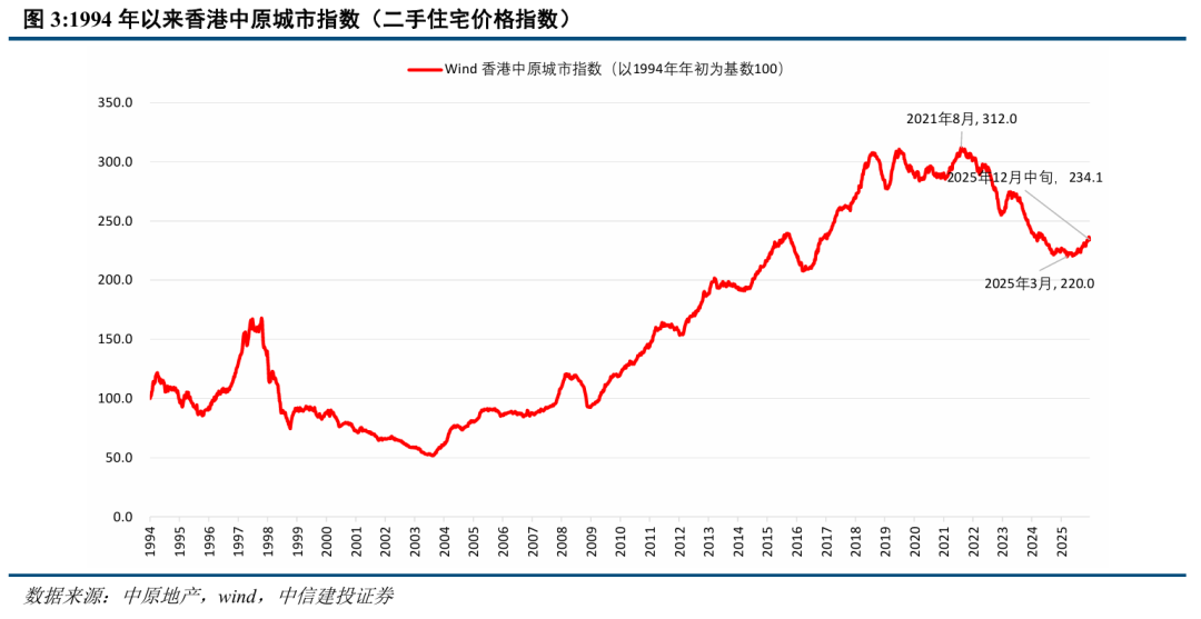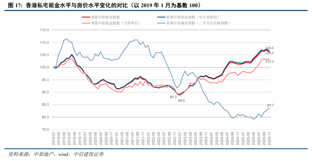 香港住宅成交量价持续回升,近期成交结构中投资性需求提升。2025年前11个月香港一二手私宅成交总量54669宗,同比增长17.0%,2025年全年有望超过6万宗,达到近13年以来仅次于2021年的第二高水平。2025年3-5月香港二手住宅价格完成底部确认,5月底的低点至今房价已回升6.2%,12月中旬房价较2024年年底增长4.3%,2025年全年有望增长4.5%。2025年3月住宅成交放量以来,500万港元以上的高总价段房源成交占比出现自2022年以来的首次反弹;同时年初以来香港中小型住宅单位的价格涨幅大于大型单位,反映出住宅市场中投资性需求的提升。