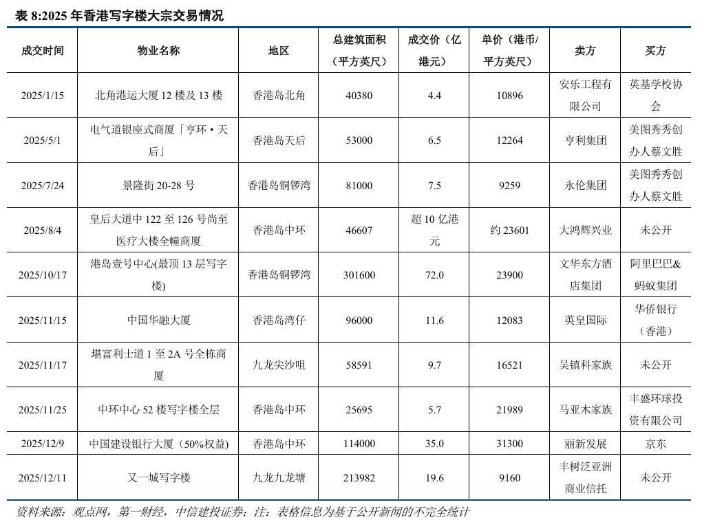 中信建投证券认为,美联储降息背景下资产配置需求的提升,是本轮住宅量价止跌回升的主因,中信建投预计2026年香港私宅成交量将增长7.9%至6.5万套、二手住宅价格增长4.0%,利好香港土储丰厚的开发商。香港商办市场则呈现整体承压、结构性改善的局面,内资企业加强在港业务布局推升了写字楼交易热度,写字楼改造为学生公寓也成为应对写字楼空置的新思路;核心区域的零售物业出租情况出现改善。
