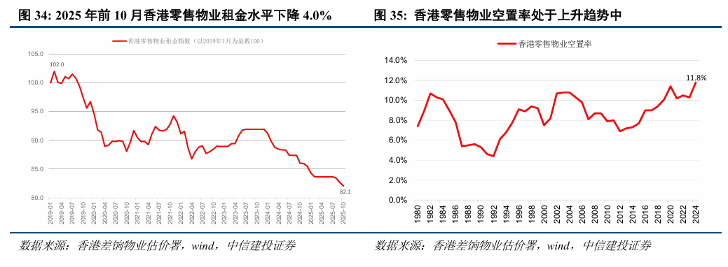 香港商办市场整体承压,现结构性改善,内地买家推升办公楼市场热度,核心区域零售物业出租向好。香港写字楼的租金仍处于下降趋势中,空置率维持在17%左右的高位,未来一年新增供应量较多背景下租金和出租率压力仍将持续;改造为学生公寓成为香港写字楼应对较高空置率的新思路,同时内资企业加强在港业务布局,推升了2025年写字楼成交的热度。港人北上次数增长、网购占比提升背景下,香港零售物业整体租金与出租率承压;在入境旅客增长、零售业销货价值同比增幅扩大的带动下,香港核心区域的零售物业出租情况结构性向好。