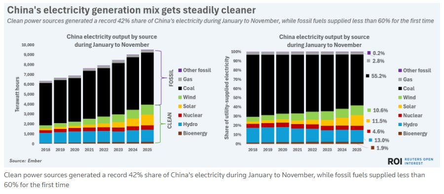 中国持续领跑全球清洁能源发展,在核电、光伏、风电及生物质能装机规模上稳居世界首位。清洁电力生产即将实现连续第七年强劲增长,能源智库Ember数据显示,2025年前11个月中国清洁发电量同比增长15.4%。