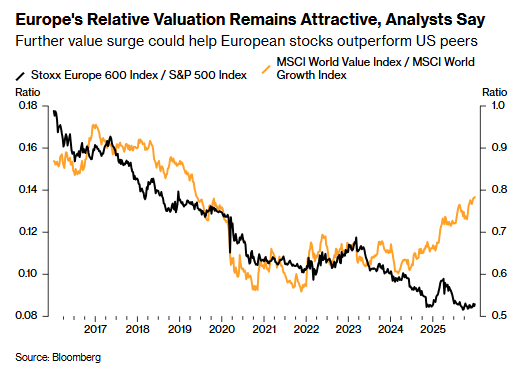 杰富瑞分析师指出,欧洲股市当前估值较美股同行仍存在大幅折价。若市场投资逻辑转向青睐“AI商业化”受益股,进而推动股市上涨行情扩散,欧洲股市的相对估值优势将愈发凸显。