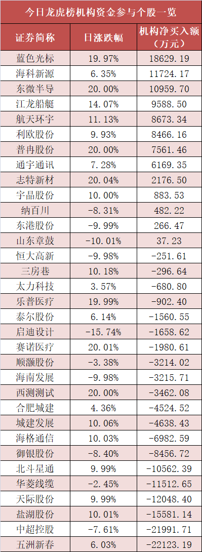 盘后龙虎榜数据显示,机构现身多股,其中蓝色光标(300058)等股票呈现机构资金净买入,五洲新春(603667)等股票呈现机构资金净卖出。
