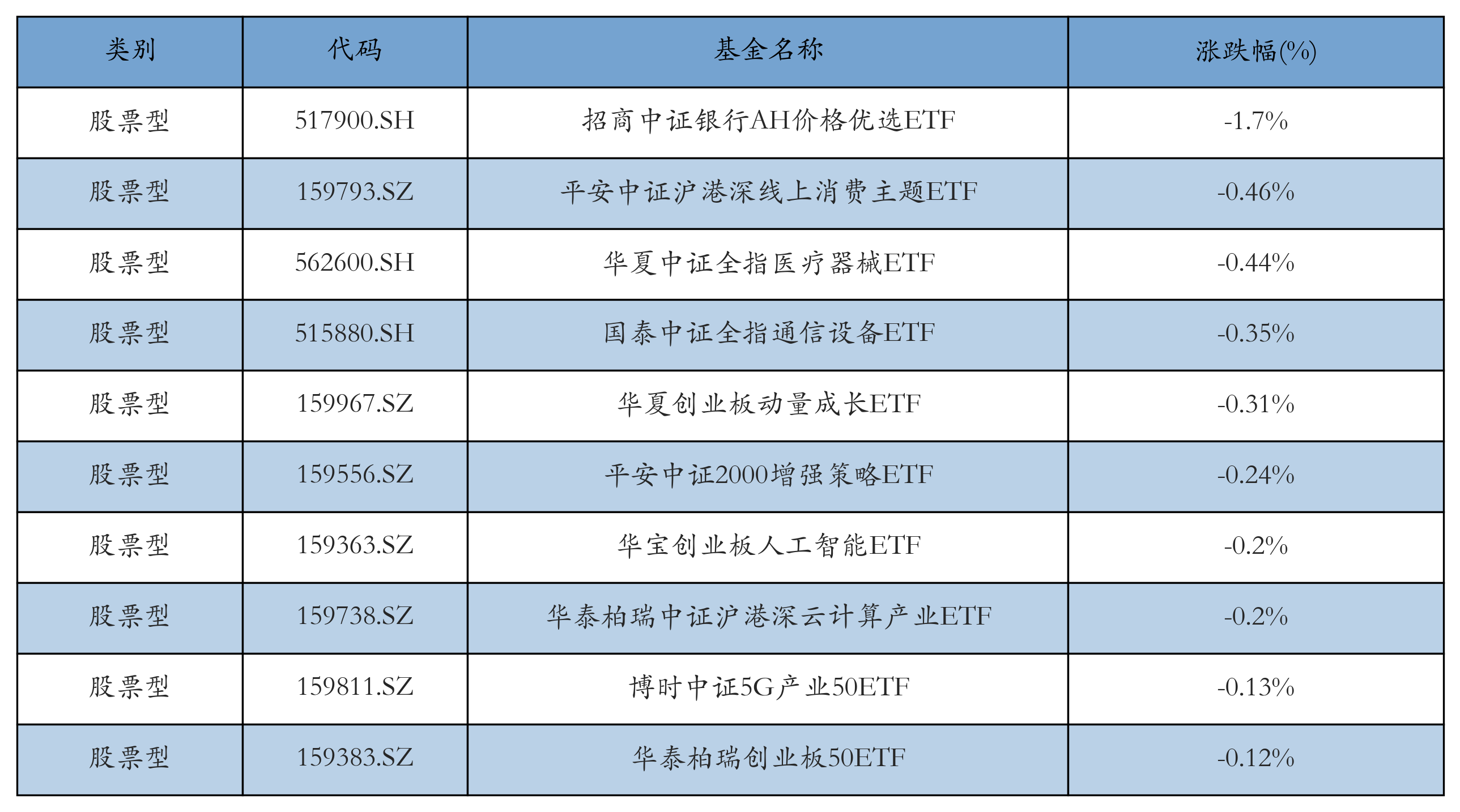昨日股票型ETF跌幅最大的3只ETF及其收益率分别为:招商中证银行AH价格优选ETF(-1.7%)、平安中证沪港深线上消费主题ETF(-0.46%)、华夏中证全指医疗器械ETF(-0.44%)。跌幅前10详情见下表: