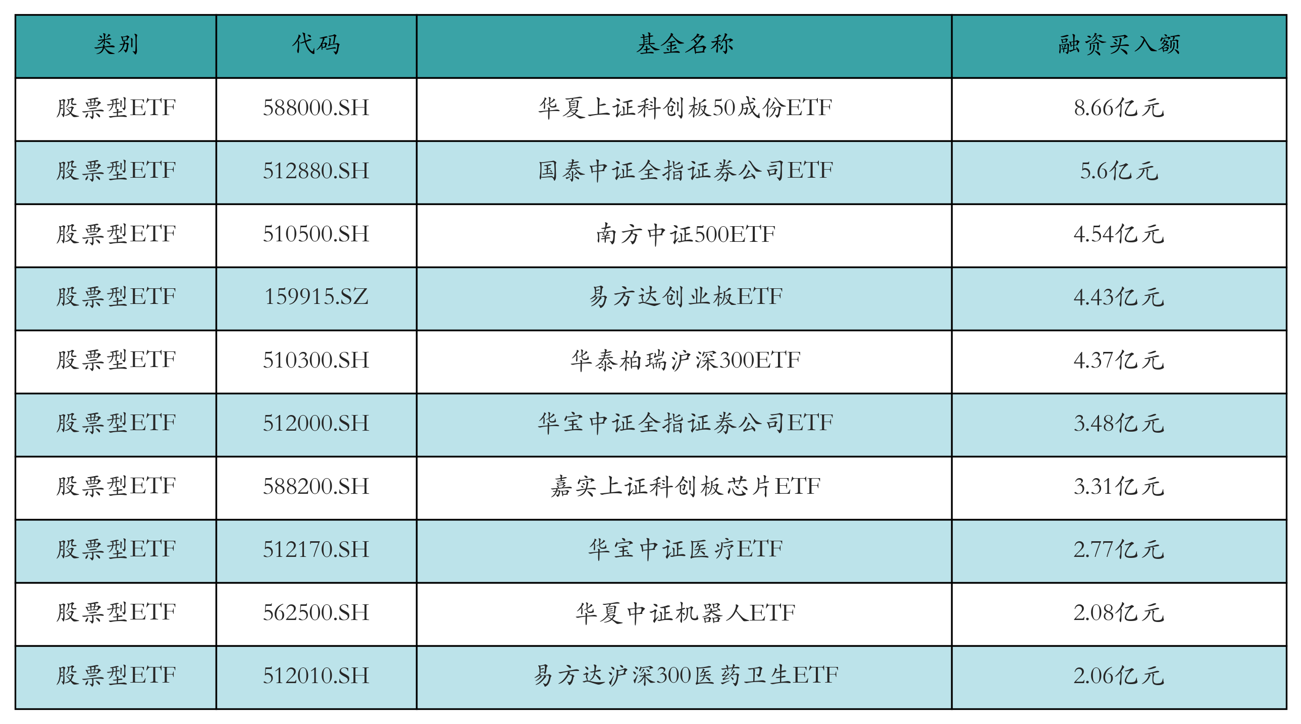 昨日股票型ETF融资买入额最高的3只ETF及其买入金额分别为:华夏上证科创板50成份ETF(8.66亿元)、国泰中证全指证券公司ETF(5.6亿元)、南方中证500ETF(4.54亿元)。融资买入额前10详情见下表: