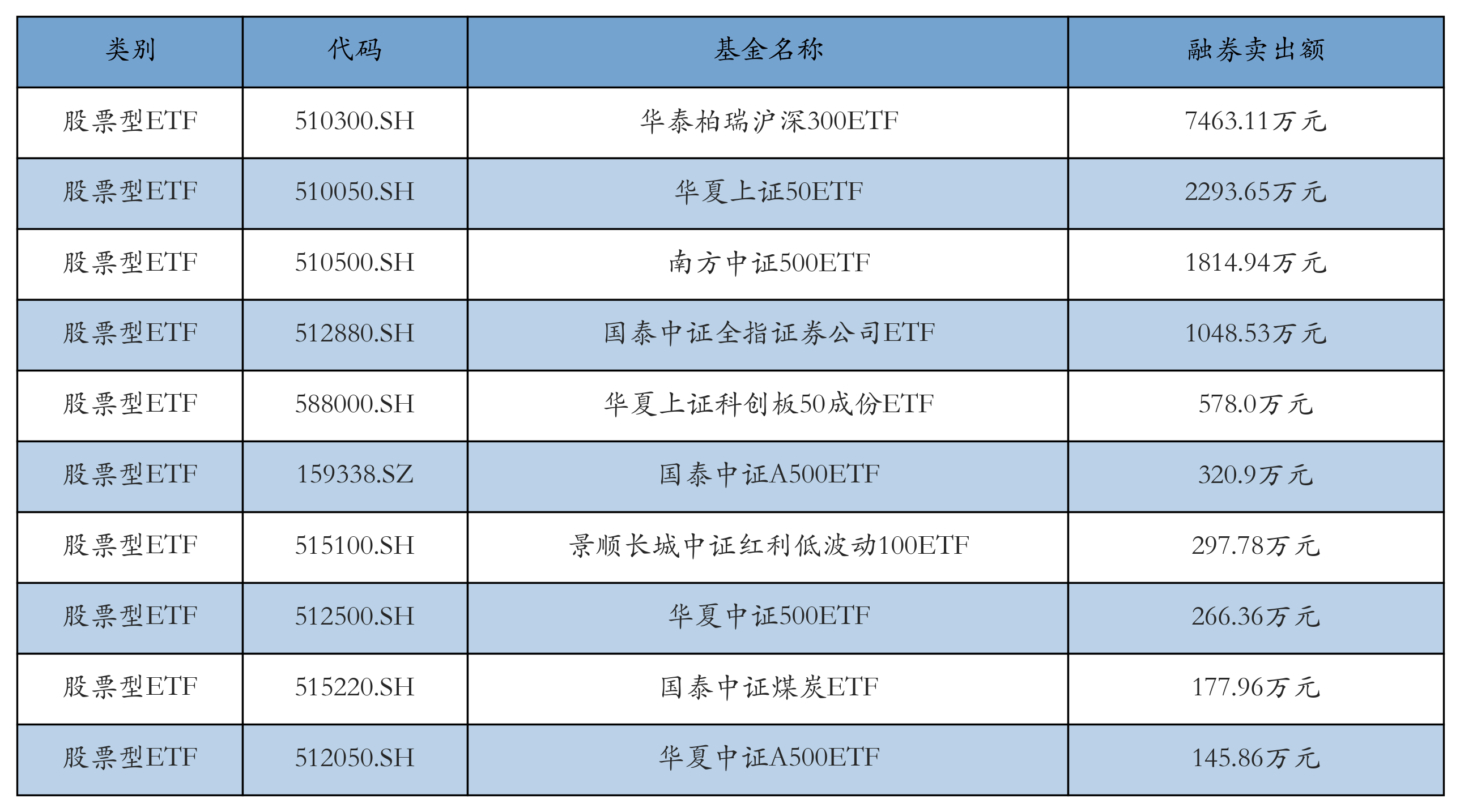 昨日股票型ETF融资卖出额最高的3只ETF及其卖出金额分别为:华泰柏瑞沪深300ETF(7463.11万元)、华夏上证50ETF(2293.65万元)、南方中证500ETF(1814.94万元)。融券卖出额前10详情见下表: