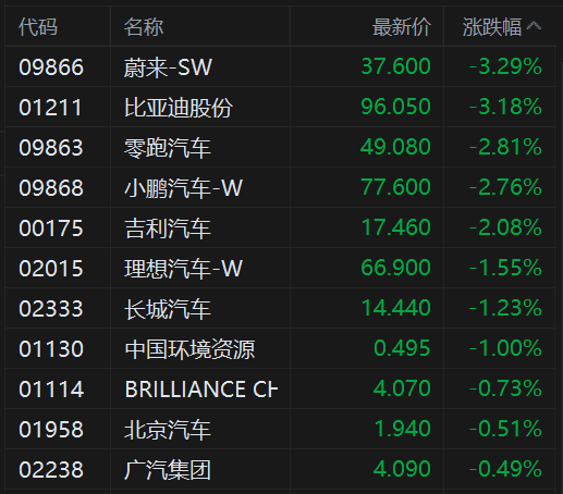 港股汽车股全线下跌,其中,蔚来汽车、比亚迪(002594)股份跌超3%,零跑汽车、小鹏汽车跌2.8%,吉利汽车跌2%,理想汽车、长城汽车(601633)、北京汽车、广汽集团(601238)均油跌幅。