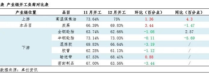 12月炭黑上下游开工延续差异化趋势,下游开工多呈走低,需求面下滑导致炭黑上涨动力不足,行业难以扭亏。终端需求表现一般,库存有所承压,炭黑下游轮胎企业开工微跌,混炼胶、密封制品开工下滑明显,炭黑市场刚需面收窄,而炭黑行业开工高位波动,社会供应面表现充裕。从卓创资讯(301299)调研情况来看,12月份炭黑行业平均开工负荷为69.83%,较上月环比小幅走高3.44个百分点,较去年同期下滑1.47个百分点。下游领域,12月卓创资讯监测的半钢轮胎生产企业月均开工负荷为73.03%,较上月走低0.11个百分点,与去年同期相比降低5.69个百分点;山东地区轮胎企业全钢胎平均开工负荷为62.66%,较上月开工走低1.08个百分点。市场供需博弈明显弱势下炭黑下游刚需议价导致炭黑难以跟涨成本涨幅,进一步加剧了行业的亏损状况。