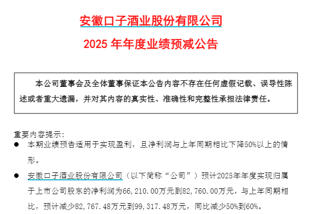 当日,口子窖(603589)(603589.SH)发布2025年年度业绩预减公告称,公司预计2025年年度实现归属于上市公司股东的净利润为6.62亿元到8.28亿元,与上年同期相比,预计减少8.28亿元到9.93亿元,同比减少50%到60%。