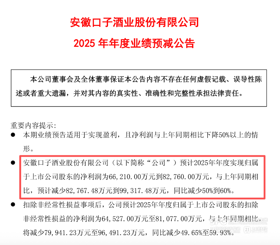 1月7日傍晚,口子窖(603589)披露2025年年度业绩预减公告:预计2025年年度实现归母净利润为6.62亿元至8.28亿元,与上年同期相比预计同比减少50%到60%。
