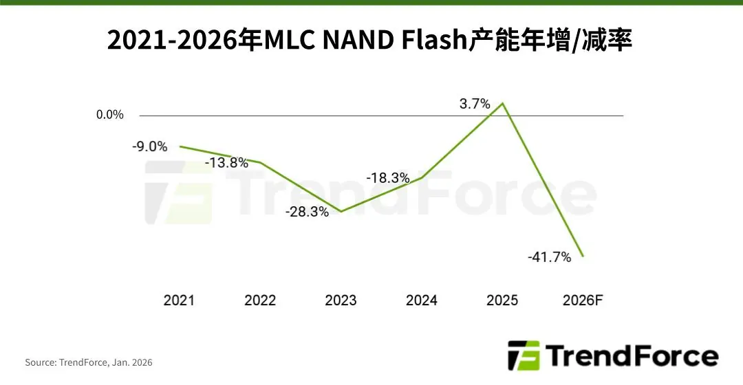 集邦咨询预测 2026 年全球 MLC NAND Flash 产能同比下降 41.7%