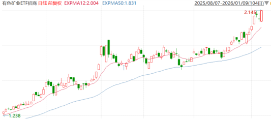 1月9日,有色矿业再度走强,云南锗业(002428)(002428.SZ)、厦门钨业(600549)(600549.SH)涨停,驰宏锌锗(600497)(600497.SH)、中钨高新(000657)(000657.SZ)、云南铜业(000878)(000878.SZ)、锡业股份(000960)(000960.SZ)、华锡有色(600301)(600301.SH)等跟涨。有色矿业ETF招商(159690)涨3.5%,盘中最高价2.145刷新上市以来新高,行情数据显示,该ETF连续10日获资金净申购约7500万元。