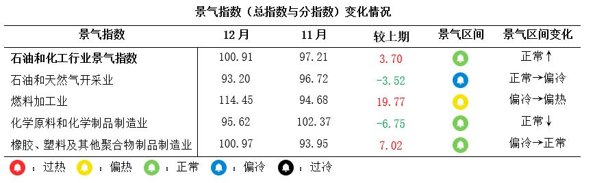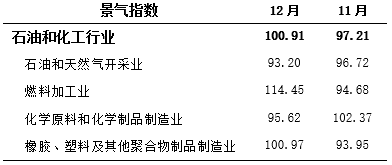 2025年12月,石油和化工行业景气指数回升至100.91,环比上涨3.7个百分点,总体呈现复苏迹象。从分指数看分化明显:石油和天然气开采业受低油价影响,“价跌利缩”状况更加突出,景气度连续下滑直至进入偏冷区间。而原油价格下跌为燃料加工业带来成本红利,行业景气度在11月因需求骤降明显下滑,12月随需求回稳再次大幅反弹。化学原料和化学制品制造业因下游行业去库存、新增采购需求减少,景气有所回落。橡胶、塑料及其他聚合物制品制造业通过“以价换量”,主动去库存,实现被动回暖。总体来看,石化行业景气指数在上下游分化的背景下实现上涨,结构性特征日益凸显。