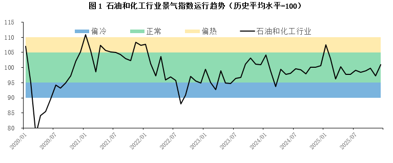 2025年12月,石油和化工行业景气指数回升至100.91,环比上涨3.7个百分点,总体呈现复苏迹象。从分指数看分化明显:石油和天然气开采业受低油价影响,“价跌利缩”状况更加突出,景气度连续下滑直至进入偏冷区间。而原油价格下跌为燃料加工业带来成本红利,行业景气度在11月因需求骤降明显下滑,12月随需求回稳再次大幅反弹。