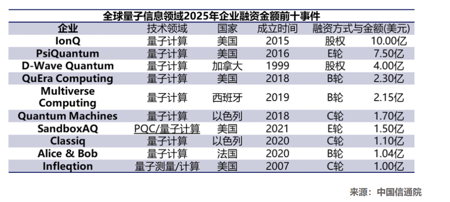 3.2025年量子信息领域市场投融资热度高涨。近十年,全球量子信息领域产业投融资事件达1400余笔,融资金融超145亿美元,其中风险投资占比约67%。今年量子计算明星企业成为资本市场的追捧热点,欧美量子企业在前十融资事件中占据8席,另外2家以色列量子计算企业和欧美生态系统联系紧密。