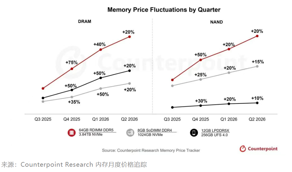 1月12日,Counterpoint Research发布存储市场内存月度价格追踪报告指出,存储市场已进入“超级牛市”阶段,当前行情超越了2018年的历史高点。AI与服务器容量需求激增推动供应商议价能力达到历史最高水平。预计2025年Q4存储价格将飙升40%–50%,2026年Q1还将再涨40%–50%,2026年Q2预计再上涨约20%。