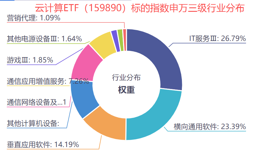 数据显示,云计算ETF(159890)跟踪云计算(930851.CSI),标的指数中IT服务+横向通用软件+垂直应用软件三大行业合计占比约65%,对AI应用有深度布局。指数前十大成分股覆盖科大讯飞、金山办公等软件开发龙头,中际旭创(300308)、新易盛(300502)两大光模块龙头,以及中科曙光、浪潮信息等电子终端及组件龙头等,双重聚焦AI基建+AI应用,或为AI大时代一站式解决方案。