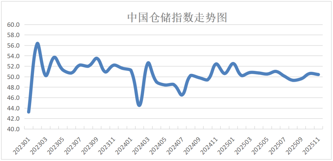 中国物流与采购联合会和中储发展股份有限公司联合调查的中国仓储指数,2025年11月份为50.4%,较上月回落0.2个百分点,仍运行在50%以上的扩张区间,新订单保持增长,设施利用率同步提高,周转效率和期末库存保持平稳,行业活跃度继续提升,企业对后市保持乐观预期。具体来看,本月指数呈现以下特征: