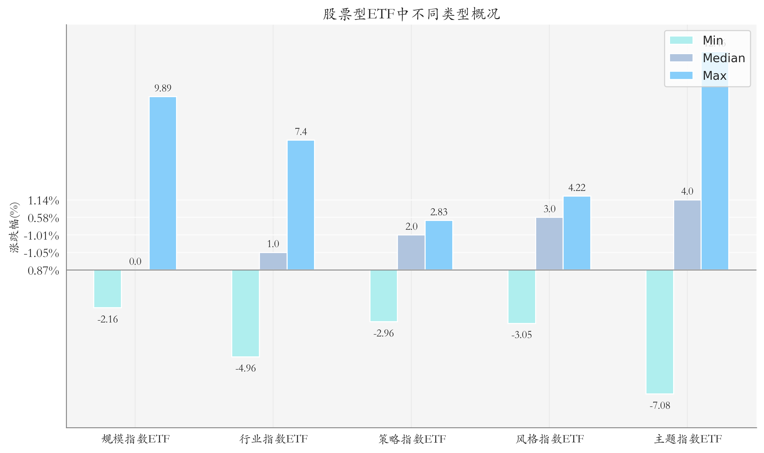 上周股票型ETF周度收益率中位数为0.59%%。其中按照不同分类,规模指数ETF中广发上证科创板100增强策略ETF周度收益率最高,为9.89%;行业指数ETF中国泰中证全指软件ETF周度收益率最高,为7.4%;策略指数ETF中华夏中证500自由现金流ETF周度收益率最高,为2.83%;风格指数ETF中建信上证智选科创板创新价值ETF周度收益率最高,为4.22%;主题指数ETF中鹏华上证科创板半导体材料设备主题ETF周度收益率最高,为12.46%。