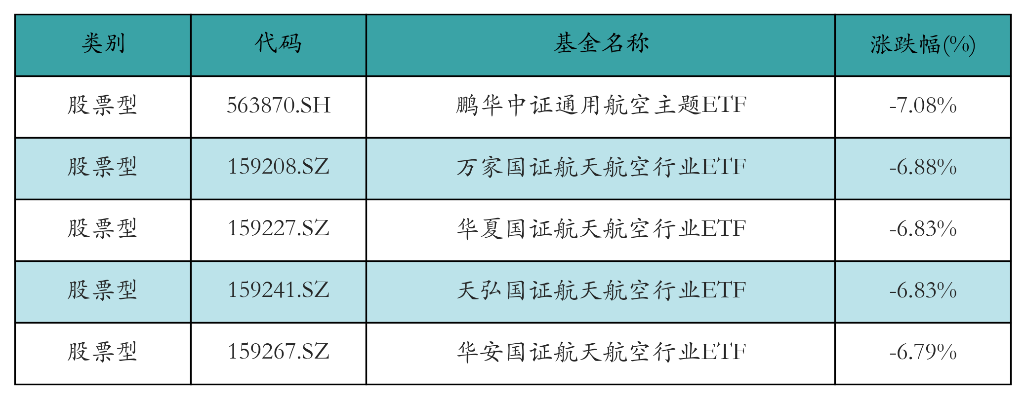 上周股票型ETF跌幅最大的5只ETF及其收益率分别为:鹏华中证通用航空主题ETF(-7.08%)、万家国证航天航空行业ETF(-6.88%)、华夏国证航天航空行业ETF(-6.83%)、天弘国证航天航空行业ETF(-6.83%)、华安国证航天航空行业ETF(-6.79%)。详情见下表: