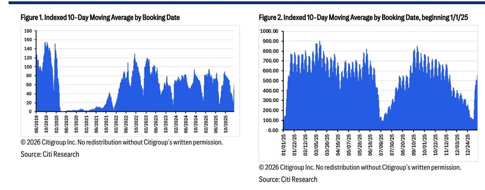 华尔街金融巨头花旗集团发布的一份航空板块研究报告显示,通过观察该机构编制的Business Travel Barometer(商务出行“晴雨表”)所显示的追踪“按预订日统计的10日移动均值”数据,该机构预计年初美国以及全球市场商务出行强势回升并将至少延续到2025年Q4之后的下一轮航空公司财报季,有望推动大型航司们业绩强劲增长。