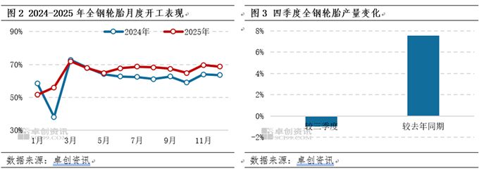 从卓创资讯(301299)监测的月度开工来看,四季度轮胎整体开工呈现倒“V”型运行趋势。季度初期,由于产销失衡压力,部分轮胎为调整库存和缓解生产成本,选在国庆假期停产放假,整体开工及产量有所下滑。排除传统假期及停产检修因素的影响后,11月轮胎开工呈现趋势性走高。而进入12月,由于需求淡季持续显现,轮胎生产端的产能释放意愿开始减弱,开工及产量呈现下滑调整。从季度产量变化来看,四季度全钢轮胎累计产量较三季度下0.96%,但较去年同期则实现7.56%的增幅。