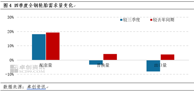 从轮胎需求市场表现来看,与三季度相比,四季度轮胎配套市场支撑较强,然替换及出口市场表现有所放缓。但与去年同期相比,四季度轮胎替换、配套及出口市场均呈现较强支撑,且增幅可观。