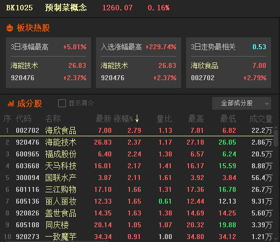 今年以来,预制菜板块多只个股收获不错的涨幅。其中,佐餐卤味龙头紫燕食品(603057)以超过40%的区间涨幅领涨板块,海能技术和三江购物(601116)等个股紧随其后。
