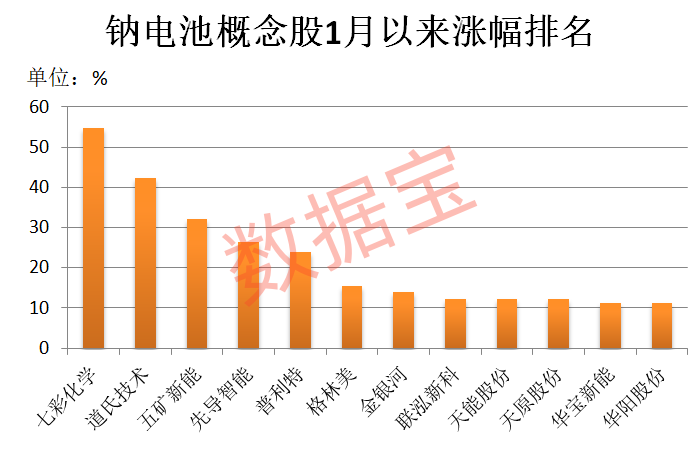 据证券时报.数据宝统计,目前A股市场布局钠电池产业的公司接近40家。截至1月23日收盘,今年以来钠电池概念股平均上涨9.88%,跑赢同期上证指数5个百分点以上。七彩化学(300758)、道氏技术(300409)、五矿新能、先导智能(300450)、普利特(002324)累计涨幅超20%。