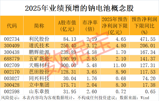 从最新公布的业绩数据来看,按照预告净利润下限计算(无下限则取公告数值),2025年净利润同比增长(含扭亏为盈)的钠电池概念股有9只,包括利民股份(002734)、道氏技术、鹏辉能源(300438)、五矿新能、天赐材料(002709)等。