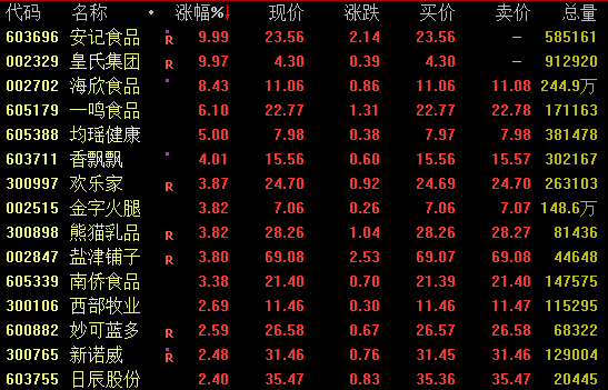 食品饮料板块盘中发力上扬,截至收盘,安记食品、皇氏集团(002329)涨停,海欣食品(002702)涨超8%,一鸣食品(605179)涨逾6%。