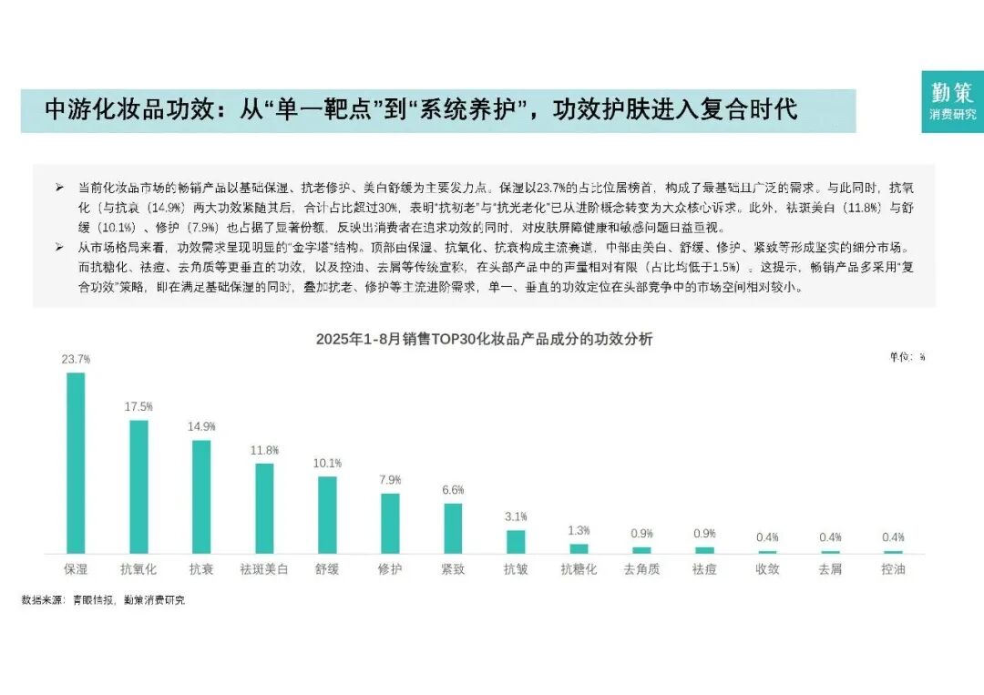 《报告》指出,随着消费者护肤认知从“盲目跟风”转向“科学护肤”,功效需求已成为行业核心增长引擎,2025年功能性护肤品市场规模达2100亿元,占整体护肤品市场的42%,同比增长32%。值得注意的是,行业已彻底告别单一成分的“概念化宣传”阶段,进入“复合功效”竞争时代,品牌通过成分科学搭配实现功效叠加,精准满足消费者多元化、进阶化护肤需求。这一转变既源于消费者需求的升级——72%的消费者已能准确区分“舒缓”与“抗敏”等细分功效,对“一瓶多效”的复合型产品需求显著提升,也得益于《化妆品功效宣称评价规范(修订版)》的监管推动,倒逼企业放弃“单一成分噱头”,转向基于科学机制的配方创新。