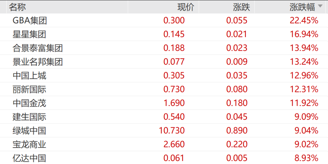 截至收盘,A股房企中盈新发展(000620)涨超10%,万科报收4.86元/股,上涨2.32%;保利发展(600048)报6.8元/股,上涨3.03%;招商蛇口(001979)收于10.07元/股,上涨2.44%。港股市场方面,GBA集团飙升超22%,星星集团涨近17%,合景泰富涨近14%,中国金茂涨近12%,绿城中国涨9%,华润置地、融创中国、万科企业、中国海外发展、碧桂园涨幅超3%。