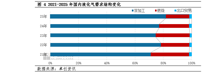 2025年国内液化气需求延续增长,市场表现出较强的需求韧性以及行业的多元化发展,另外市场需求继续向化工方向倾斜,燃烧需求近年连续萎缩。