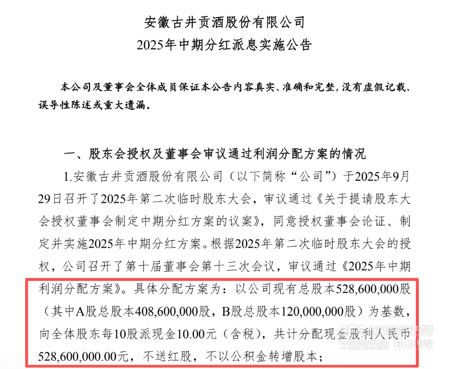 2月1日下午,古井贡酒(000596)披露了2025年中期派息实施报告,以公司现有总股本5.286亿股为基数,向全体股东每10股派10元人民币现金,共计5.286亿元。