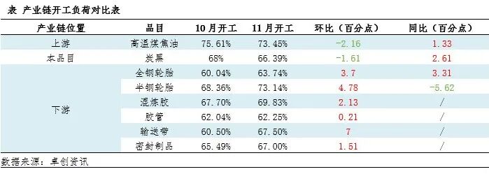 11月炭黑与下游开工呈现分化趋势,下游开工虽有恢复性走高但对涨价抵触下议价运行,行业利润水平在原有亏损的基础上进一步走低。从卓创资讯(301299)调研情况来看,11月份炭黑行业平均开工负荷预估值为66.39%,较上月环比小幅走低1.61个百分点,较去年同期上升2.61个百分点。下游领域,11月卓创资讯监测的半钢轮胎生产企业月均开工负荷为73.14%,较上月走高4.78个百分点,与去年同期相比降低5.62个百分点;山东地区轮胎企业全钢胎平均开工负荷为63.74%,较上月开工走高3.72个百分点。11月炭黑下游制品企业虽然开工环比多表现走高现象,但主要出于假期影响因素减弱,开工表现恢复性走高,整体提升幅度较小,而11月炭黑企业开工水平虽有小幅下滑但仍处历史高位,行业整体供需失衡局面仍难以缓解,加之上旬下游企业多在低位备货,中下旬炭黑调涨后下游拿货积极性减弱,消耗前期备货库存为主,导致炭黑市场实盘高位成交一般,炭黑成本增加但炭黑企业多以交付前期低价订单为主,进一步使得亏损幅度走扩。